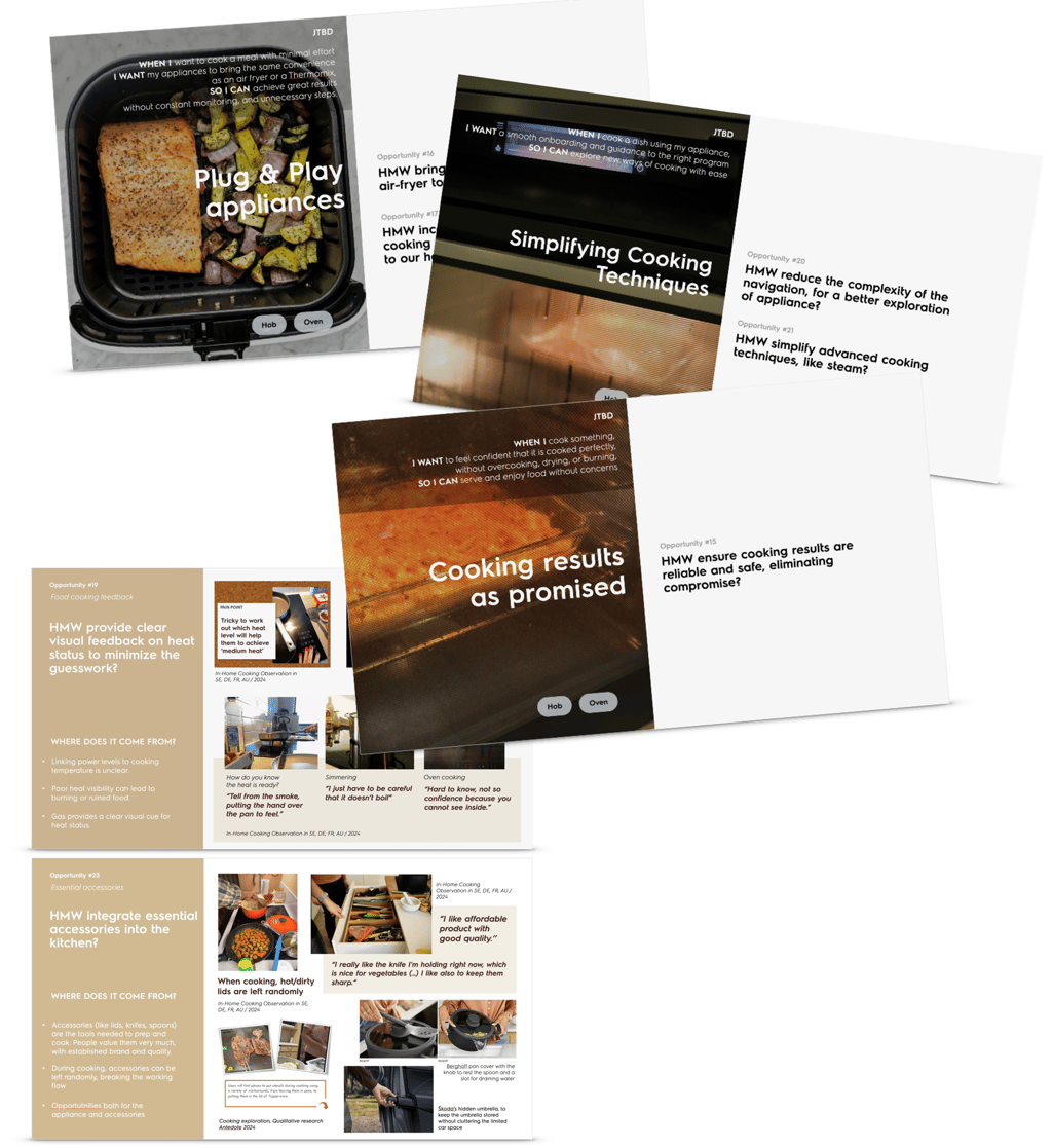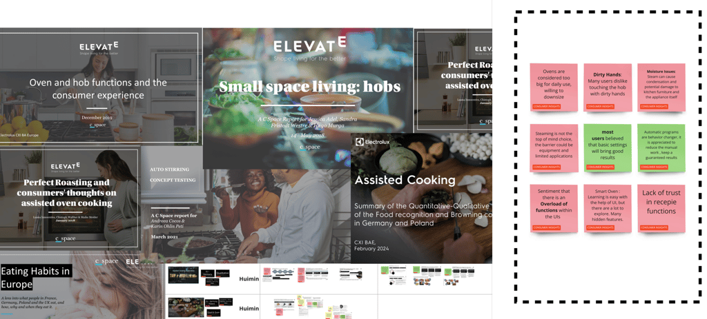 We reviewed internal Electrolux reports and collected insights to build a clear understanding of current surface cooking. This groundwork helped us define guiding principles to shape and inform the next steps in our field research.