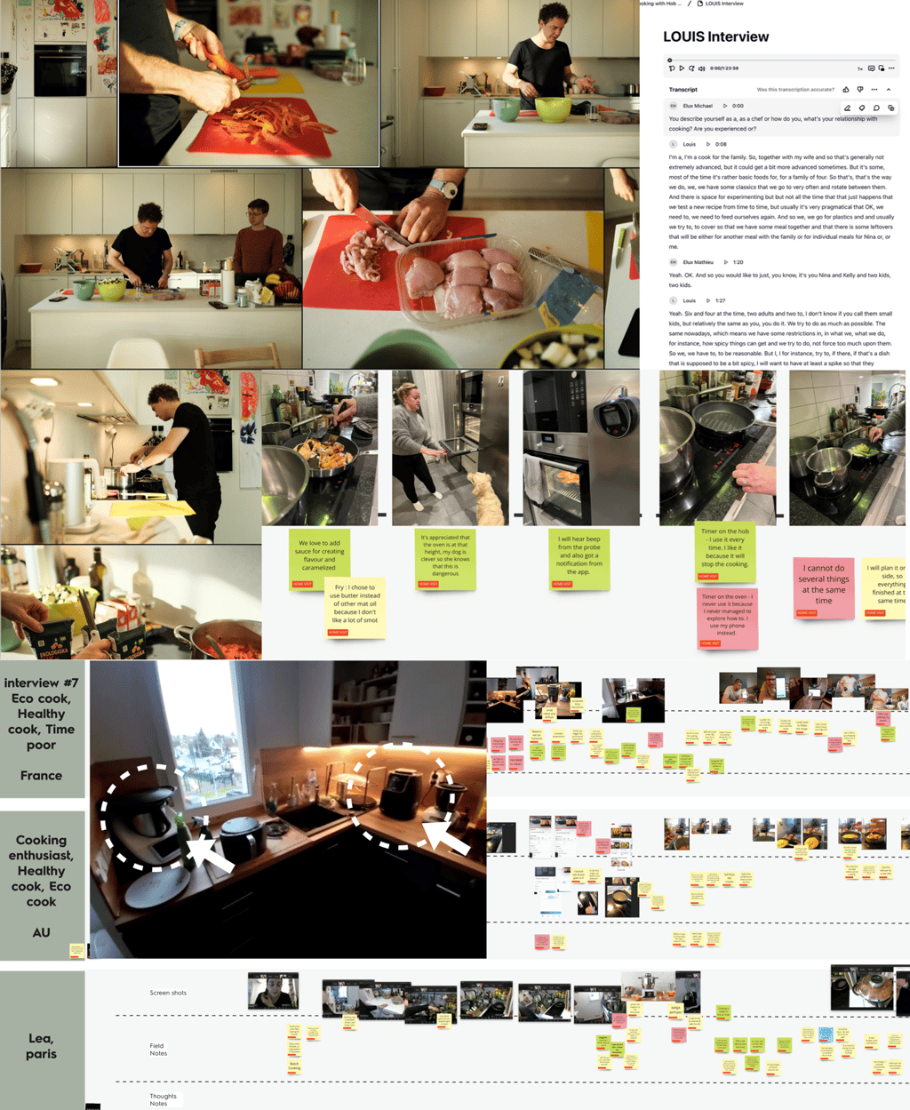 A core part of our research was fieldwork: interviewing chefs, observing users cooking in their homes, running a 10-day cooking journal with our teams, and holding empathy sessions where we cooked ourselves with different appliances and techniques.