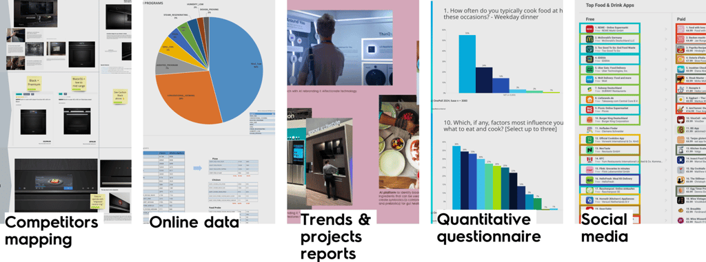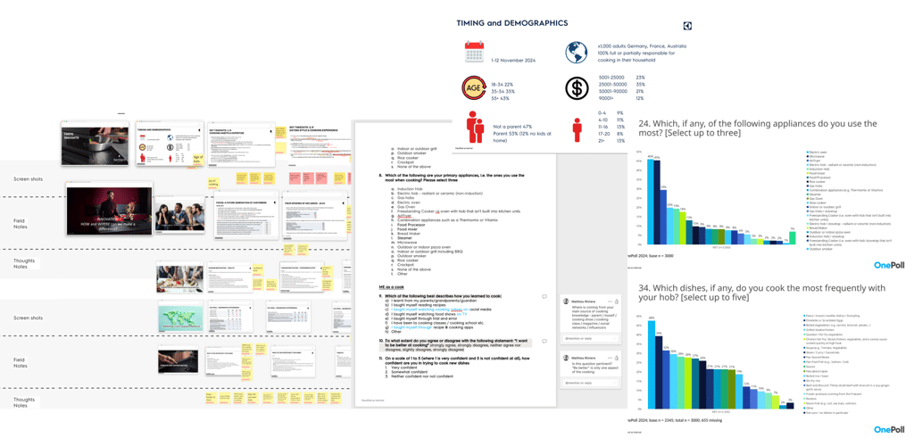We began with desktop research, reviewing existing reports and insights to build on what was already known and spot knowledge gaps. This included competitor mapping, exploring the connected product data lake, tracking current trends, running a quantitative survey in France, Germany, and Australia, and analyzing the most-used cooking apps in Europe.